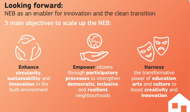 NEB poskytne nástroje a usmernenia na zvýšenie efektívnosti a udržateľnosti zastavaného prostredia a lepšie využívanie nedostatočne využívaných a neobsadených priestorov. Vypracuje aj digitálny katalóg o koncepciách cenovo dostupného a odolného bývania a bude financovať vytvorenie demonštrátorov NEB prezentujúcich nízkouhlíkové, obehové riešenia a riešenia využívajúce biologické materiály.
