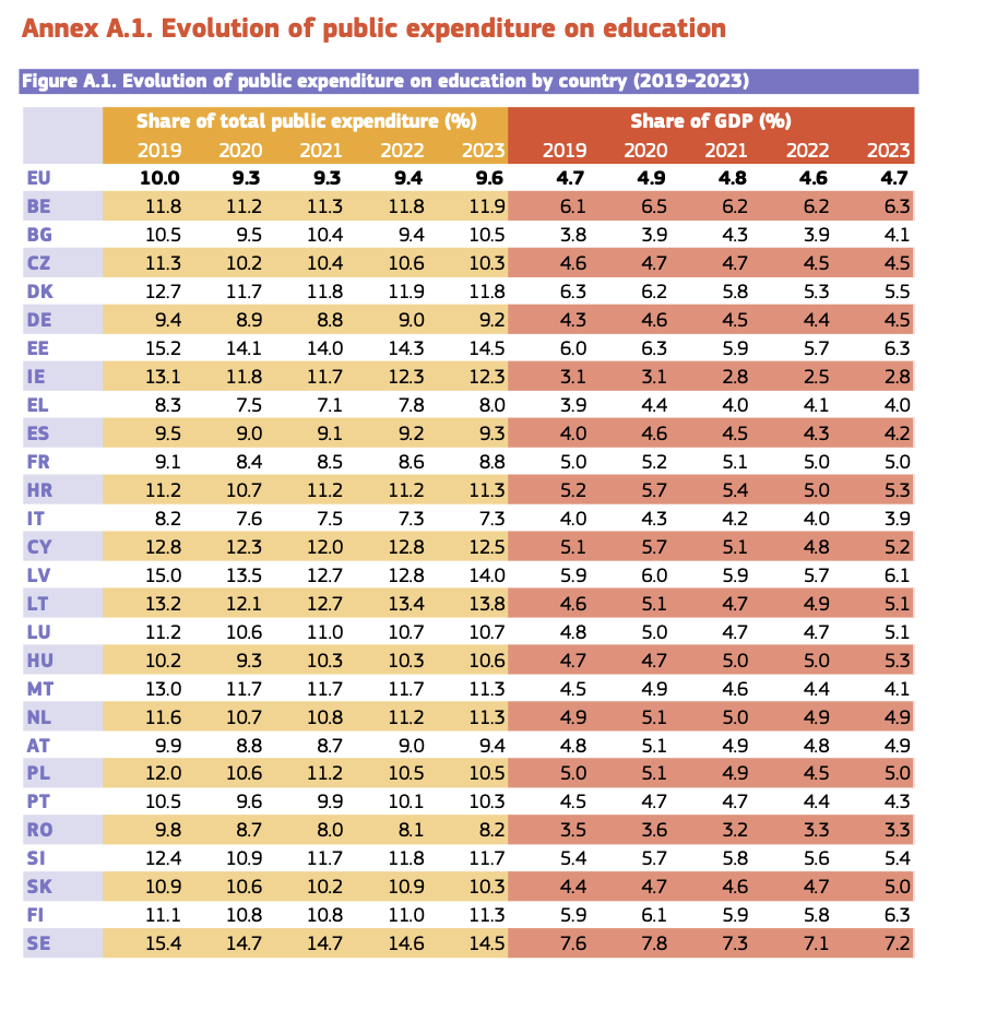 Výdavky na vzdelávanie v členských štátoch EÚ sa po pandémii postupne zotavujú, no stále nedosahujú predpandemickú úroveň. Podľa najnovších údajov z roku 2023 priemerne dosiahli 9,6 % celkových verejných výdavkov a 4,7 % HDP, no medzi krajinami sú značné rozdiely. Výdavky na Slovensku sa držia na priemernej úrovni EÚ a sú porovnateľné s úrovňou pred pandémiou Covid-19.