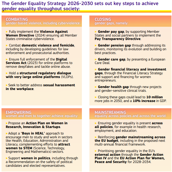 Cieľom tejto novej stratégie je posilniť opatrenia EÚ v kľúčových oblastiach, riešiť nové problémy a zintenzívniť prácu na vykonávaní existujúcich právnych predpisov a politík. Stratégia začleňuje rodovú rovnosť do všetkých aspektov života, online aj offline, od vzdelávania a zdravia až po prácu a verejný život, a rieši moderné hrozby, ako je kyber násilie a riziká súvisiace s umelou inteligenciou, ktoré postihujú najmä ženy.