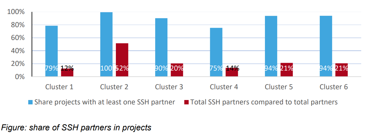 - 88 % financovaných projektov zahŕňalo aspoň jedného partnera z oblasti SSH, zatiaľ čo 22 % všetkých partnerov boli zástupcovia z oblasti SSH.