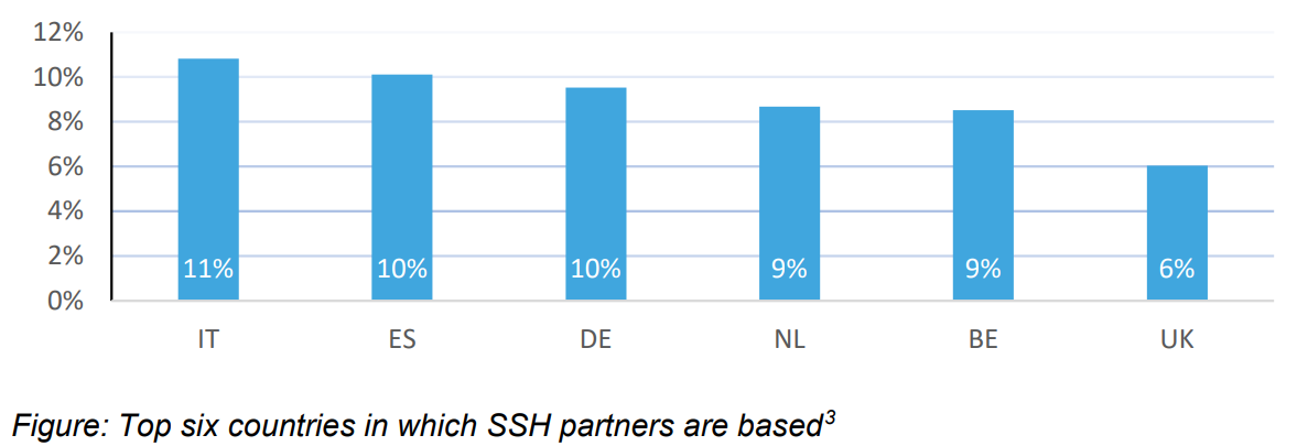 - Medzi krajiny, ktoré najviac prispeli k integrácii SSH počtom partnerov bolo zaradené Taliansko, Nemecko a Španielsko. Tieto tri krajiny tvoria takmer tretinu celkového podielu partnerov v oblasti spoločenských a humanitných vied.