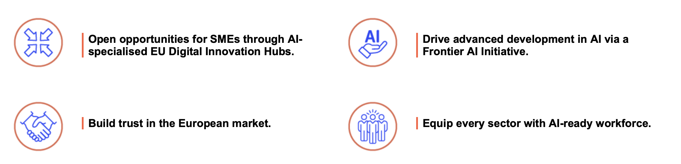 Komisia na tieto opatrenia mobilizuje približne 1 miliardu EUR z fondov ako Digital Europe či EU4Health. Medzi konkrétne kroky patrí zriadenie AI screeningových centier v zdravotníctve a podpora vývoja hraničných modelov a agentickej AI pre sektory ako výroba, životné prostredie a farmácia. Podporuje politiku „AI first“, aby viac spoločností považovalo umelú inteligenciu za súčasť riešenia výziev, pričom sa starostlivo zohľadňujú prínosy a riziká tejto technológie.