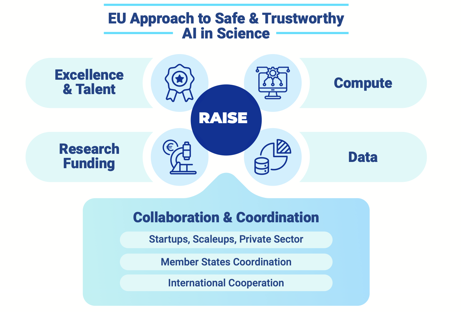 Európska komisia plánuje spustiť pilotnú fázu iniciatívy RAISE s rozpočtom 108 miliónov EUR z programu Horizont Európa (pracovný program 2026–2027) počas prvého Summitu AI in Science, ktorý sa uskutoční 3.–4. novembra 2025 v Kodani pod dánskym predsedníctvom Rady EÚ. Podujatie bude možné stredovať aj online. Zároveň vznikne aj koordinačný mechanizmus pre AI vo vede prostredníctvom akcie typu Coordination and Support Action (CSA) v rámci pracovného programu na rok 2025. Komisia bude na budovaní RAISE úzko spolupracovať s členskými štátmi a súkromným sektorom, pričom zriadi aj vysokú akademickú poradnú radu RAISE, ktorá bude dohliadať na strategické smerovanie a vedeckú kvalitu celej iniciatívy.