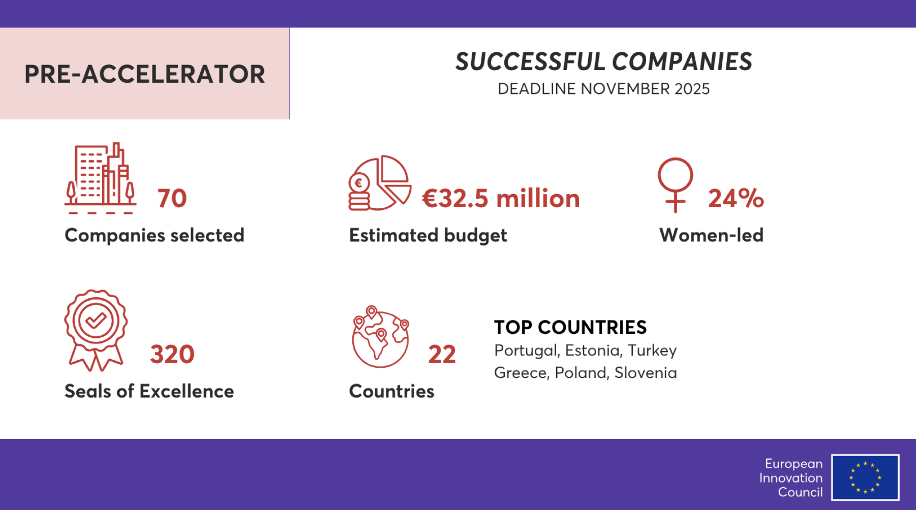 Celkovo bolo v rámci výzvy na rok 2025 vybraných 70 firiem z 22 krajín, ktoré si rozdelia približne 32,5 milióna EUR s maximálnou možnou dotáciou až 500 000 EUR na spoločnosť. Najvyšší počet úspešných návrhov zaznamenali Portugalsko a Estónsko. Program EIC Pre-Accelerator zároveň udelil 320 prestížnych ocenení Seal of Excellence projektom, ktoré síce neboli financované z dôvodu obmedzeného rozpočtu, avšak spĺňajú vysoké hodnotiace kritéria.