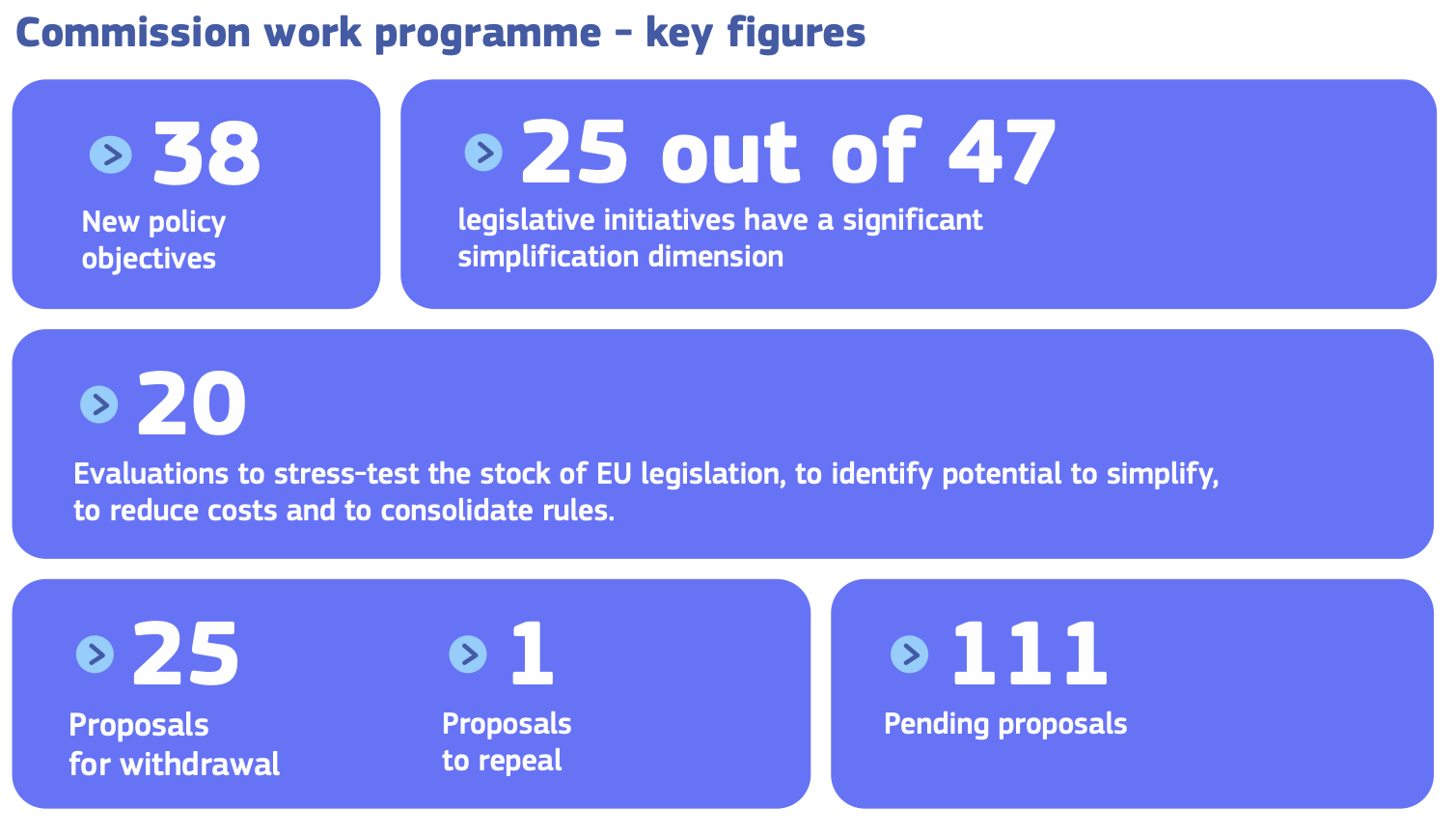 Komisia predstavila 21. októbra svoj nový pracovný program na rok 2026. Program vychádza z politických usmernení predsedníčky von der Leyenovej a prejavu o stave Únie z roku 2025. Posilňuje kľúčové priority EÚ, ktorými sú  konkurencieschopnosť, čisté a digitálne inovácie, sociálny model a kolektívnu bezpečnosť. Silný dôraz sa kladie na zjednodušenie právnych predpisov EÚ a zníženie administratívnej záťaže. Očakáva sa, že tieto opatrenia prinesú ročné úspory pre podniky a občanov vo výške viac ako 8,6 miliardy EUR. Zároveň je pracovný program úzko prepojený s kompasom EÚ na obnovu konkurencieschopnosti