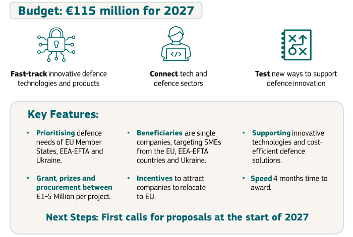 Program AGILE, pilotný nástroj v objeme 115 miliónov EUR, ktorého cieľom je urýchliť prechod prevratných obranných technológií z laboratórií do praktického využitia. Zapája najmä malé a stredné podniky (MSP), vrátane start-upov a scale-upov. Úlohou AGILE je reagovať na potrebu veľmi krátkych inovačných cyklov, čím umožňuje vývoj, testovanie a nasadenie v priebehu týždňov alebo mesiacov namiesto rokov. Je prispôsobený subjektom v oblasti „novej obrany“, ktoré pôsobia vo vysokom tempe, rýchlo meniacom sa digitálnom prostredí konfliktov.