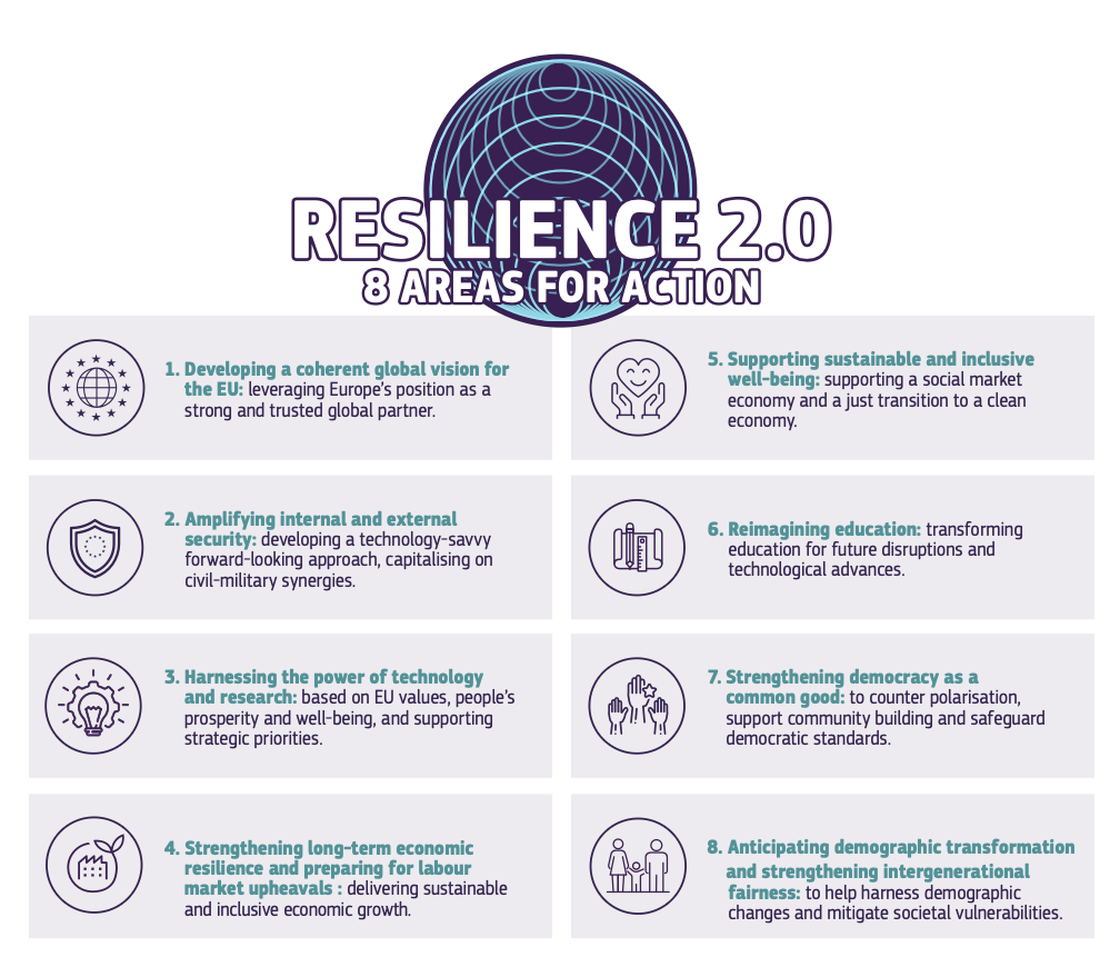 Európska komisia zverejnila 9. septembra 2025 Správu o strategickom výhľade na rok 2025, ktorá prináša koncept „Odolnosť 2.0“. Tento prístup má pomôcť EÚ čeliť výzvam, ako sú klimatické zmeny, bezpečnostné hrozby či globálna konkurencia, a zároveň podporiť prosperitu občanov a podnikov. Správa zdôrazňuje potrebu strategickej autonómie, konkurencieschopnosti a ochrany demokracie.