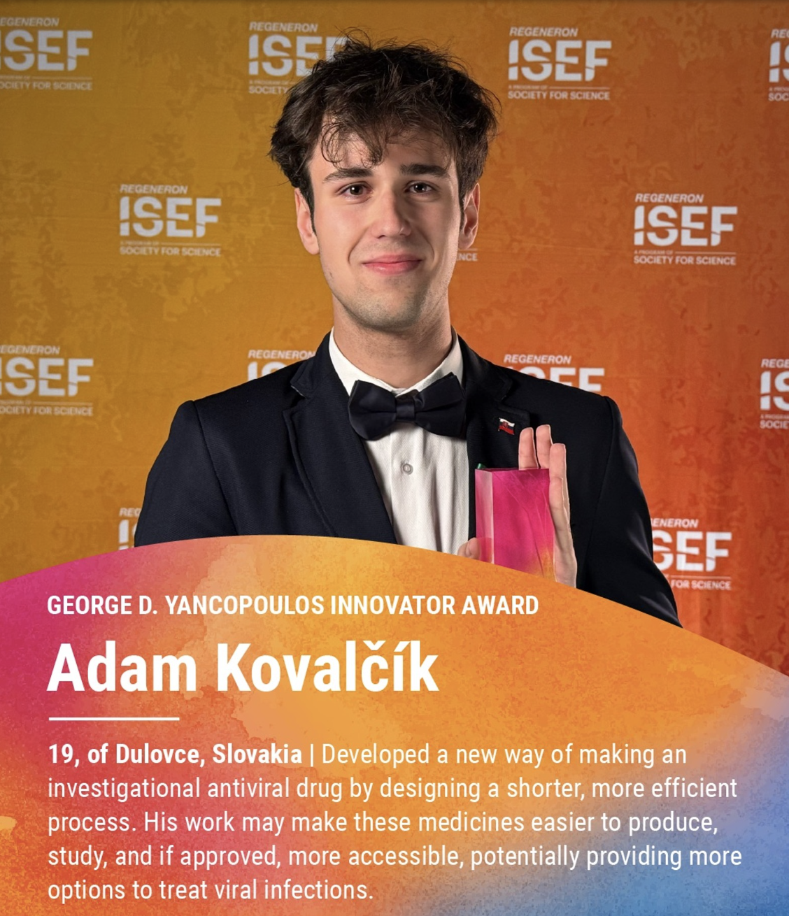Devätnásťročný Adam Kovalčík, študent Gymnázia M. R. Štefánika v Nových Zámkoch, dosiahol mimoriadny úspech na Regeneron International Science and Engineering Fair (ISEF) 2025 v americkom meste Columbus (Ohio), kde získal hlavnú cenu súťaže – George D. Yancopoulos Innovator Award – a finančnú odmenu vo výške 100 000 dolárov.