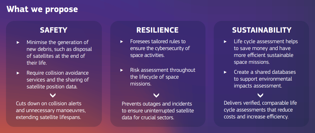 Európska komisia predstavila svoj návrh Vesmírneho zákona, ktorého cieľom je poskytnúť právnu istotu, ktorú prevádzkovatelia vesmírnych činností v Únii potrebujú na svoj výkon a podporu konkurencieschopnosti vesmírneho priemyslu, pričom sa bude zaoberať rizikami vyplývajúcimi z exponenciálneho rastu vesmírnych činností a zabezpečí dlhodobé a udržateľné využívanie vesmíru.
