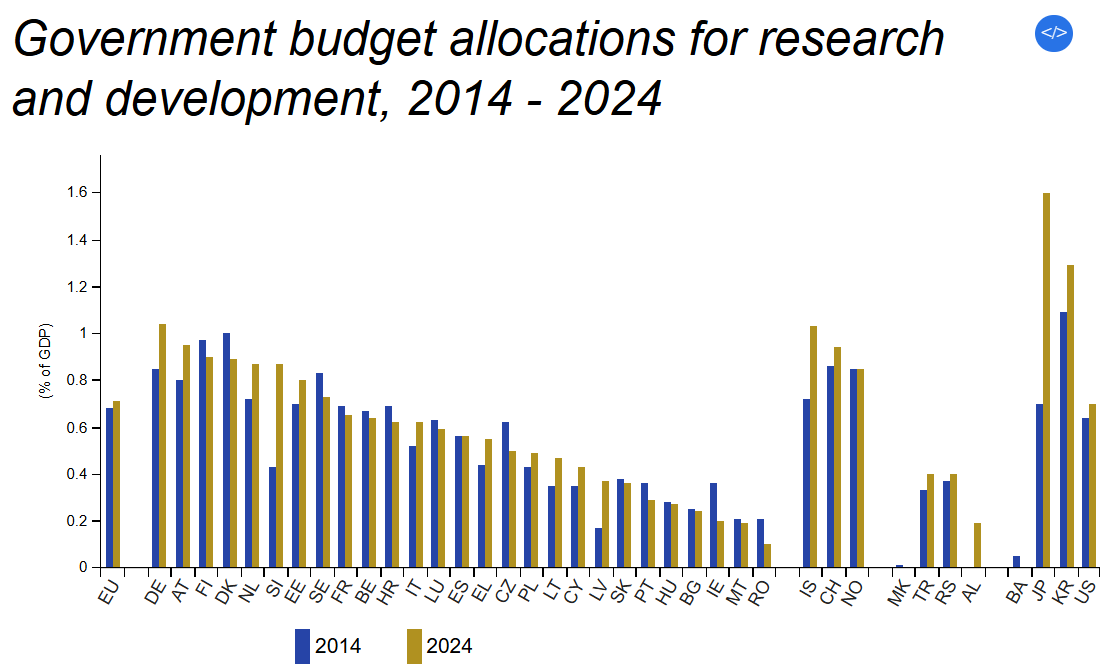 Eurostat zverejnil údaje o rozpočtových alokáciách vlád krajín EÚ na výskum a vývoj v roku 2024 (GBARD). Celková úroveň alokácií zo všetkých krajín EÚ sa odhaduje na úroveň 127,9 miliardy EUR, čo predstavuje približne 0,71 % HDP ekonomiky EÚ. V porovnaní s rokom 2023 ide o zvýšenie o 3,4 %. V porovnaní s rokom 2014 ide o zvýšenie o 60 %. Výška vládnych rozpočtových alokácií na VaV na Slovensku v roku 2024 dosiahla 0,36 % HDP (468,30 milióna EUR), pričom v roku 2014 boli na úrovni 0,38 % HDP (289,25 milióna EUR).
