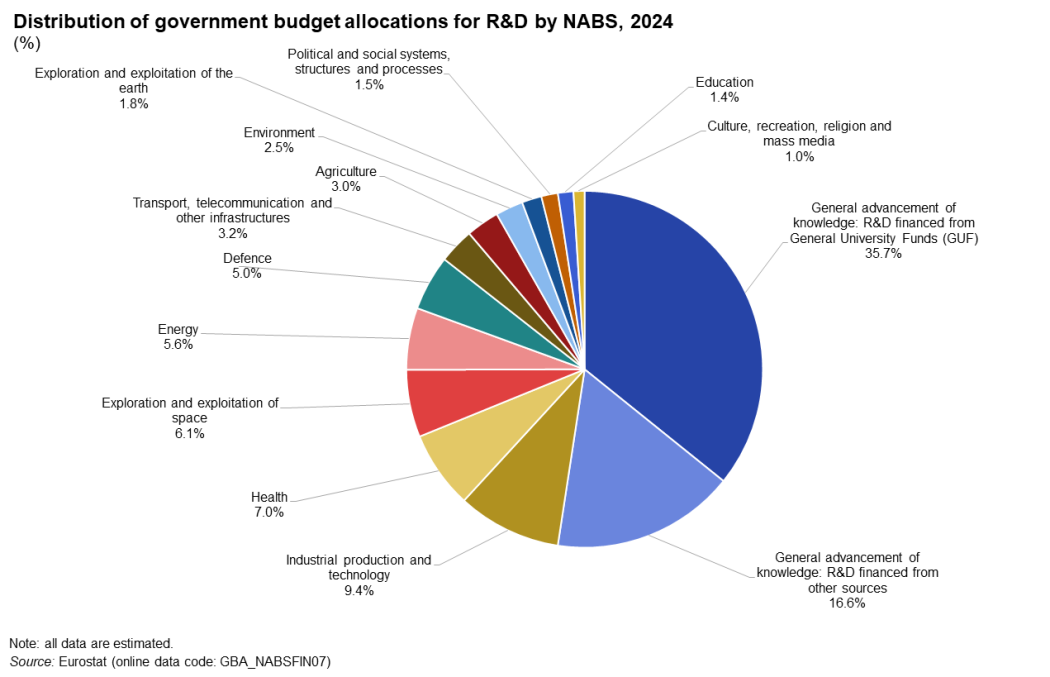 Z hľadiska rozdelenia podľa socioekonomických cieľov bola viac ako tretina výdavkov vlád krajín EÚ na výskum a vývoj v roku 2024 určená na všeobecný rozvoj vedomostí, financovaných predovšetkým z verejnej blokovej dotácie známej ako verejné všeobecné univerzitné fondy (GUF), ktoré verejné vysoké školy využívajú na podporu svojich činností. Okrem toho bolo 16,6 % venovaných všeobecnému rozvoju vedomostí z iných zdrojov ako GUF, 9,4 % priemyselnej výrobe a technológiám, 7,0 % zdravotníctvu a 6,1 % na výskum a využívanie kozmického priestoru.