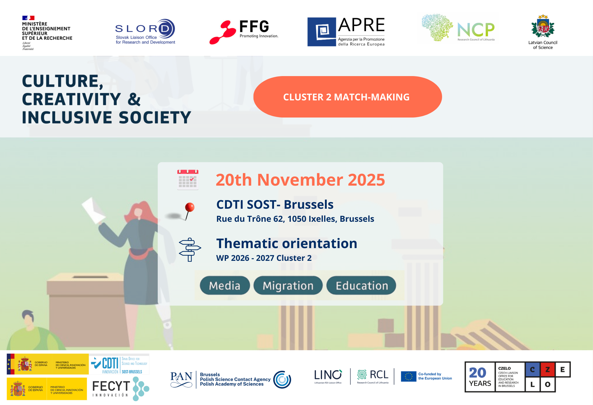 On November 20, 2025, we are organizing another match-making event for you. This time it will focus on Cluster 2 of Horizon Europe – Culture, Creativity and Inclusive Society.