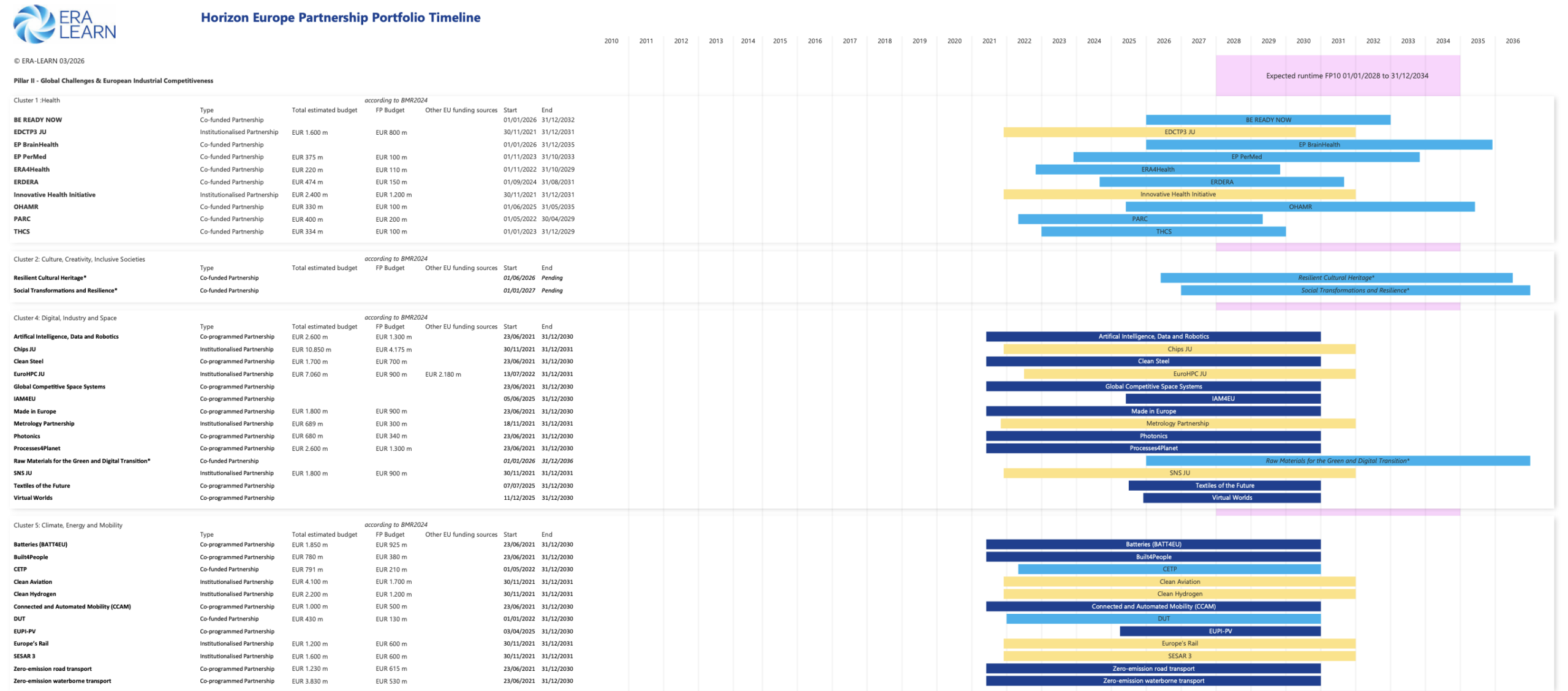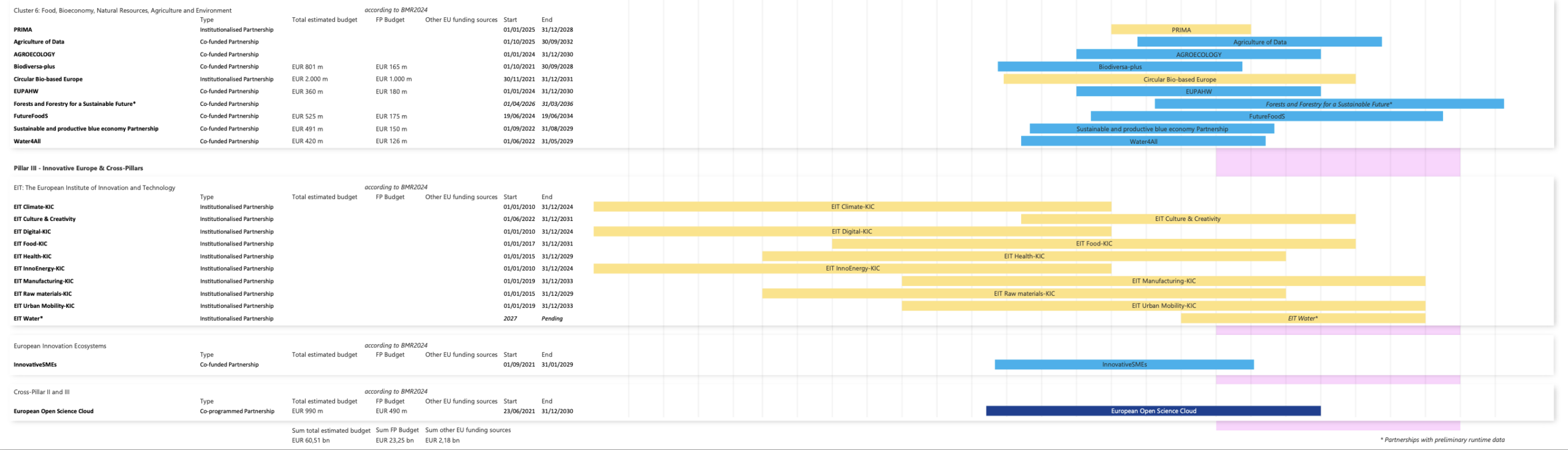 Údaje o časovom harmonograme partnerstiev boli prevzaté z databázy ERA-LEARN a systému CORDIS. Rozpočtové údaje boli prevzaté z dvojročnej monitorovacej správy (BMR2024).